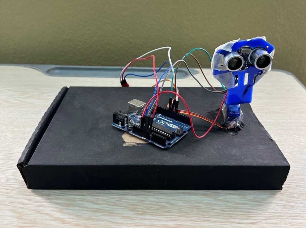The ultrasonic sensor which needs to move 180° is attached to the servo motor. The servo motor and ultrasonic sensor are connected to the Arduino.